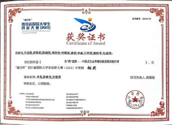 4、2023年12月获得第九届四川省国际“互联网+”大学生创新创业省级铜奖。