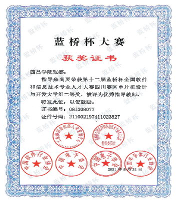 5、2020.11指导学生雍尚玲参加第十一届“蓝桥杯”四川赛区单片机设计与开发大学组三等奖