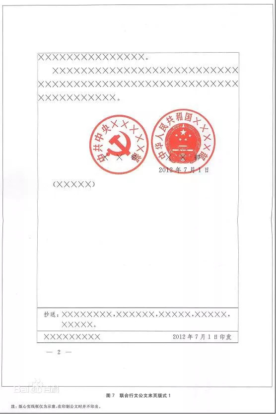 联合行文时,一般将各发文机关署名按照发文机关顺序整齐排列在相应位置,并将印章一一对应、端正、居中下压发文机关署名,最后一个印章端正、居中下压发文机关署名和成文日期,印章之间排列整齐、互不相交或相切,每排印章两端不得超出版心,首排印章顶端应当上距正文(或附件说明)一行之内。