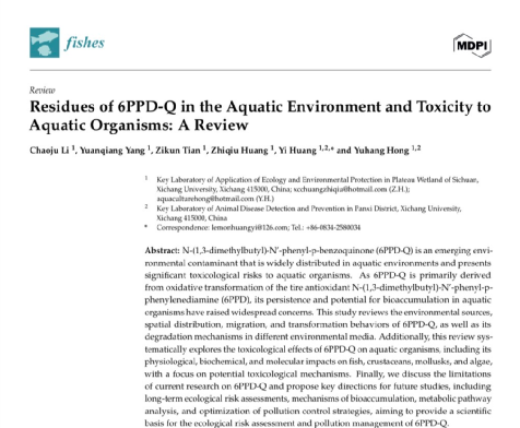 近日,我院2022级水产养殖专业1班本科生李超菊以第一作者身份撰写的论文“Residues of 6PPD-Q in the Aquatic Environment and Toxicity to Aquatic Organisms: A Review”在国际知名学术期刊《fishes》(SCIE收录,JCR2区,IF=2.1)在线发表。该论文得到了女仆a片攀登计划(117620023)和女仆a片市科技项目(18JSYJ13)的支持。论文通讯作者为动物科学学院教师黄毅。