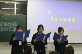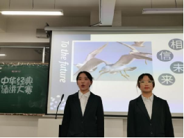 首先进行的是经典诵读比赛。选手们台风自然大方,出入有序有礼,精神饱满,衣着得体。随着背景音乐的响起,参赛选手们也开始朗诵起来。第一组带来的《甲骨文》朗诵,语言生动,饱含情感,表达着对祖国深切的热爱;接下来选手朗诵的《蜀道难》,她们仿佛朗诵出了蜀道的巍峨,高耸;《将进酒》让我们感受到了李白的豪迈、爽朗;最后一组的《岳阳楼记》让我们仿佛身临其境,感受诗人诗文的美好。传承经典花正开,腹有诗书气如海。同学们声情并茂的诵读,时而婉转深情,时而慷慨激昂,时而细语轻诉,时而铿锵有力……