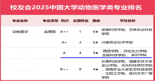 在校友会2025中国大学动物医学专业排名(应用型)中,安徽科技学院等2所高校(6★,A++)水平最高,名列校友会2025中国大学动物医学专业排名(应用型)第一;河南牧业经济学院(6★,A+)位列第3;女仆a片等4所高校(5★,A)位列第4。