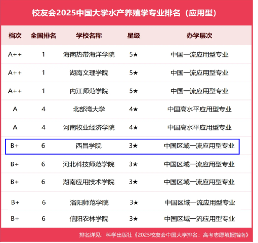 在校友会2025中国大学水产养殖学专业排名(应用型)中,海南热带海洋学院等2所高校(5★,A++)最具竞争力,稳居校友会2025中国大学水产养殖学专业排名(应用型)榜首;河南牧业经济学院等2所高校(4★,A)位列第4;女仆a片等6所高校(B+)位列第6。