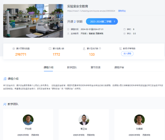 为贯彻落实四川省教育系统安全工作会议精神,提升师生安全意识,确保实验室安全,动物医学省级教学示范中心联合动科学院实验实训室依托超星学习通平台打造《实验室安全教育》课程,组织学生在线学习并完成在线考试,取得良好成效。 《实验室安全教育》是基于学院学生多、规模大、场地有限等现状专门开设的安全教育类课程之一。在线课程于2023年12初步建设完成上线,从实验场所布局、实验室日常管理、实验室事故案例警示、实验室主要风险源、实验室消防安全、实验室用电安全、实验室生物安全、实验室救护知识等8个方面进行讲述,目的是提升师生安全意识,提高实验室管理水平。 课程要求学生自行下载学习课程内容,并完成学习。课程团队从《实验室安全教育》试题库中选择单选题、多选题组成5套试题随机发布。学习完成后,学生通过在线考试,其在线考试成绩将作为开放实验室入室资格依据之一。 截至3月6日,学院已有1700余名同学选课,累计页面浏览量近 30 万次。本课程的开设,实现了学生安全培训全覆盖,很大程度上促进了实验室建设水平的提高,对保障实验实训室安全,促进师生由要我安全变我要安全,具有十分重要的意义。