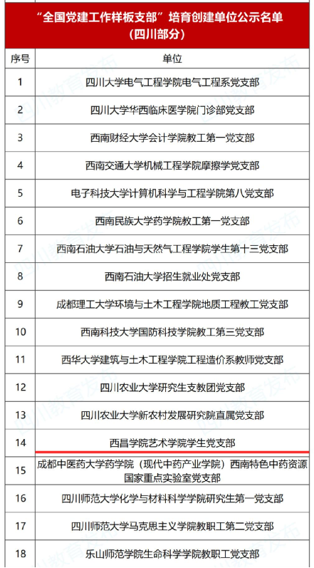近日,教育部办公厅公布了第四批新时代高校党建示范创建和质量创优工作评选结果。此次高校党建“双创”工作共面向全国高校共遴选出10个党建工作示范高校、100个党建工作标杆院系、1001个党建工作样板支部作为培育创建单位,我校艺术学院学生党支部入选“全国党建工作样板支部”培育创建单位,建设周期为2年。