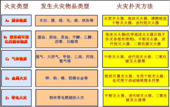(4)依据救灾的基本方法采取相应措施。火灾扑救应采用适当的消防器材,具体包括: