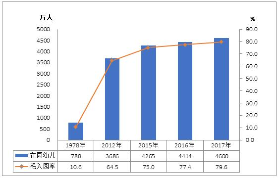 图1 1978年、2012年、2015-2017年学前教育在园幼儿和毛入园率