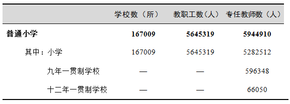 小学教职工[7]564.53万人,比上年增加10.80万人,增长1.95%;专任教师[8]594.49万人,比上年增加15.58万人,增长2.69%。专任教师学历合格率[9]99.96%,比上年提高0.02个百分点。生师比16.98:1。