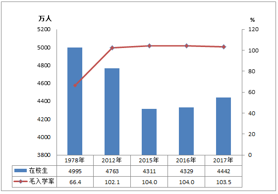 图2 1978年、2012年、2015-2017年小学在校生和净入学率