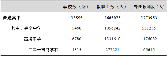 普通高中教职工266.51万人,比上年增加7.31万人,增长2.82%;专任教师177.40万人,比上年增加4.05万人,增长2.34%。生师比13.39:1;专任教师学历合格率98.15%,比上年提高0.24个百分点。