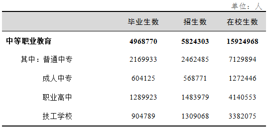 中等职业教育毕业生496.88万人,比上年减少36.75万人,下降6.89%。其中,普通中专毕业生216.99万人,比上年减少12.03万人;职业高中毕业生128.99万人,比上年减少12.88万人;技工学校毕业生90.48万人,比上年减少2.59万人;成人中专毕业生60.41万人,比上年减少9.25万人。