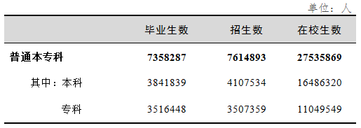 普通本专科招生761.49万人,比上年增加12.88万人,增长1.72%;在校生2753.59万人,比上年增加57.74万人,增长2.14%;毕业生735.83万人,比上年增加31.65万人,增长4.49%。