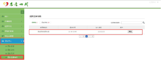 如果志愿者在个人中心选择的是“我的团队”菜单,发起的加入团队申请,那么团委需要到后台的“团队中心”的“团队招募审核”这一菜单进行审核: