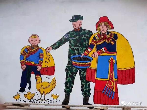 活动中虽然只有师生两人,但是仍以集体为单位进行创作,共同绘制墙面。山区乡村阴冷潮湿、气候恶劣、工具简陋,给壁画绘制带来了不便,但这并没有难到志愿者们。为了争取绘制时间,志愿者们既分工又合作,以饱满的热情、以为精准扶贫风险的精神,克服各种困难,精心绘制壁画。在整个工程设计中,志愿者们把“军民一家亲”作为整个任务的绘制主题,万江老师采用村民们喜闻乐见的图文形式设计创作,其色彩之鲜艳,构图之和谐,想象力之丰富,令人感到惊喜,同时凸显了军民之间互帮互助的氛围,传递出爱党爱国爱家的正能量。