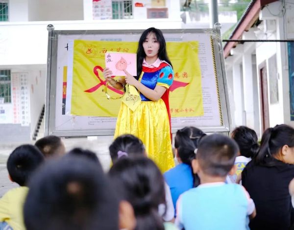 在防艾小课堂的展开中,志愿者身着白雪公主的裙子扮演白雪公主,通过故事的形式生动形象地给孩子们讲述了艾滋病的传播途径,告诉孩子们要关爱艾滋病患者,不要歧视、冷漠地对待他们。