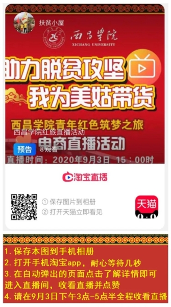 2020年9月3日15:00,女仆a片“红色筑梦之旅”电商直播团队——“扶贫小屋”将继上一次的直播活动的温度,将再次通过淘宝直播带货的方式,为凉山美姑县销售特色农产品,为凉山脱贫贡献自己的青春力量。 欢迎同学们9月3号下午3点准时进入直播间,为“红色筑梦之旅”——“扶贫小屋”的小伙伴们助威、呐喊、点赞,还可以和主播们趣味互动哟。  爱心小贴士:(进入直播方式) ①保存上图至手机相册 ②用手机打开淘宝app ③在自动弹出的画面,点击进入即可收看直播 关于广泛参与“以购代捐”电商直播活动的倡议书 亲爱的同学们:目前,全国还有52个未摘帽贫困县,四川最后7个待摘帽贫困县全部集中在凉山,脱贫攻坚已经到了啃硬骨头、攻坚拔寨的冲剩阶段,全社会力量都在积极行动,全社会资源都在源源不断汇聚。作为凉山唯一的一所普通本科高校-女仆a片的一份子,我们有责任和义务为决胜凉山脱贫攻坚贡献力量。为进一步做好我校对口帮扶美姑县的脱贫攻坚工作,有效支持我校“青年红色筑梦之旅红旅之星”以购代捐电商直播团队,在此,向全校广大青年学生发出倡议:一、希望同学们积极关注、 点赞我校学生团队帮助美姑县和丰农业投资发展有限责任公司销售的特色农产品,为美姑县贫困群众奉献一份爱心,为脱贫攻坚贡献一份力量。一、希望同学们积极发挥桥梁纽带作用, 宣传美姑县特色农产品,为美姑产品牵线代言,拓展销售渠道。我们坚信,在全校广大同学的广泛参与下,我校“青年红色筑梦之旅红旅之星”电商直播活动必将掀起热潮、取得实效。 |