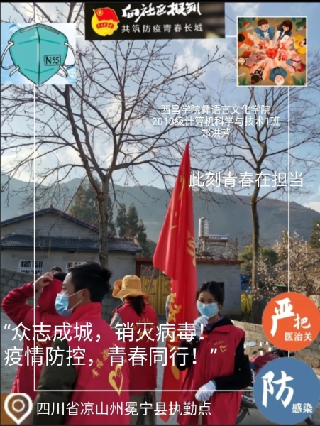 疫情肆意生长, 等待春天的时光好像无比的漫长。 但这个冬天并不寒冷, 因为有一颗颗热切的心在抗疫前线奋斗, 有一群群热情的人在远方支援。 西院志愿者亦挺身而出, 奉献出自己的一份爱心! 疫情阻断了交通,但阻断不了爱。俗说患难见真情,这一次,让我们一起来感受爱的力量与温度吧! 教师教育学院 疫情面前没有旁观者,疫情防控没有局外人。      信息技术学院 齐心协力抗疫情,愿一切都向好的方向转变!      彝语言学院 做“守护者”,就是要担使命、保安康。    机械与电子工程学院 隔离病毒,但不隔离爱,因为爱是桥梁。    这些爱,足以温暖这一整个冬天。当全民同心战疫情时,春天也一定会更加明媚的到来。 让我们心相连、情相拥、爱相通, 众志成城克时艰, 勤力同心战疫情。 于寒冬深处, 守一轮云开月明, 候一片春暖花开, 等一场期盼已久的相逢! 向最美志愿者们致敬! |