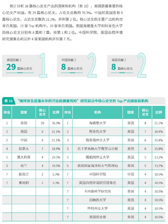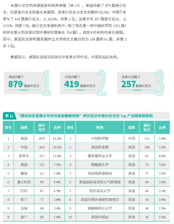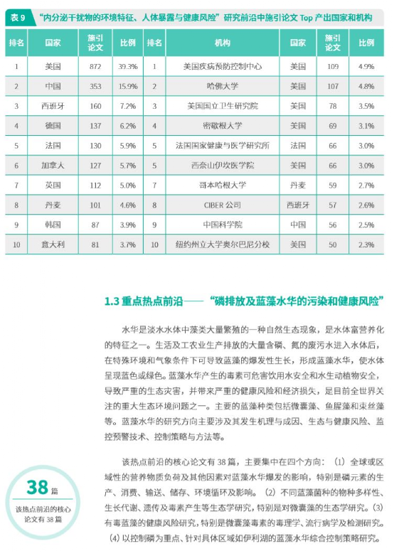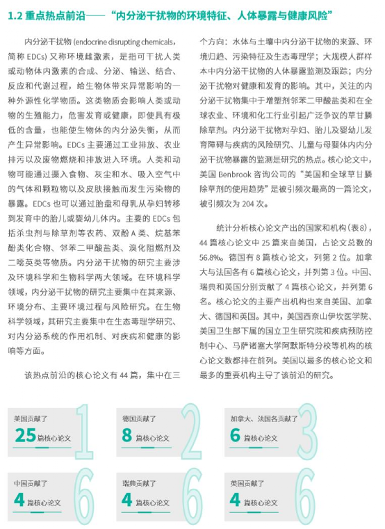 -环境人Environmentor 日前,中国科学院科技战略咨询研究院、中国科学院文献情报中心与科睿唯安联合在京发布了《2019研究前沿》和《2019研究前沿热度指数》报告。报告显示,2019年,在十大学科领域整体层面,美国最为活跃,位居全球首位。中国位居第二,英国、德国和法国分别为第三、第四和第五。中国和美国之间的差距正在进一步缩小。 生态与环境科学领域的Top10 热点前沿主要分布在生态科学和环境科学两个子领域,水体生态环境问题及多学科解决方案仍是研究前沿重要的关注点。 具体来看,环境科学子领域的热点前沿主要涉及利用微生物的污水处理技术、水中污染物分析分离技术和环境污染物的环境特征与风险研究。其中,污水处理技术相关的前沿包括“活性污泥消化技术的机理、工艺与影响因素”、“厌氧氨氧化技术及在污水处理中的应用”及消化过程中“微生物种间电子转移的机理及应用”。水中污染物分析分离技术包括“利用纳米复合材料吸附去除水中有毒金属离子”、“金属有机框架材料去除水中污染物”及“用于液体中有毒物质及生物活性物质分析、分离的新型材料的制备与功能”。环境污染物的环境特征与风险研究方向的前沿为“内分泌干扰物的环境特征、人体暴露与健康风险”。 生态科学子领域的热点前沿主要涉及宏观大尺度的生物圈和生态系统的变化与风险,包括3个前沿:“地表植被覆盖变化对气候的影响”、“在全球尺度上对外来物种入侵的监测及影响分析”和“磷排放及蓝藻水华的污染和健康风险”。