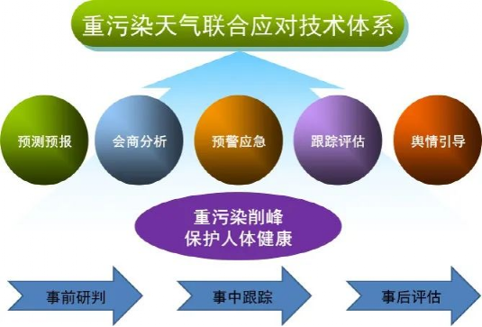 图1.1:重污染天气联合应对技术体系 中国环境科学研究院联合其它295家单位,近2000名优秀科学家和一线科技工作者组成了攻关队伍,针对4大研究专题,成立了28个专家团队深入“2+26”城市一线进行驻点跟踪和技术指导,经过两年半的研究,实现了大气重污染成因与治理关键技术突破,建成国内最大的区域天地空立体综合观测网,量化了污染排放、气象过程、化学转化和区域传输对重污染过程的贡献,全面弄清了秋冬季重污染成因,提出了系统性解决方案。与2016年相比,2019年“2+26”城市重污染天数减少44.5%,北京市重污染天数减少89.7%。攻关重点支撑的“2+26”城市空气质量改善速率大幅提升,明显高于其它重点区域。越来越多的蓝天给人民群众带来了更多的幸福感。