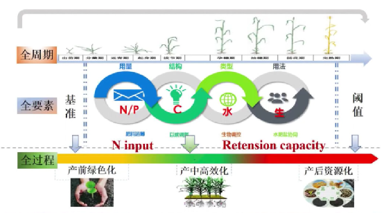 图6.1:全链条农业面源污染控制技术体系 针对粮食增产稳产压力下化肥不合理施用以及种养脱节造成的水环境问题,中国农科院环发所张晴雯团队以农业有机废弃物资源化利用为纽带,结合产业链上下游,从理论、技术、产品进行全链条创新研发,搭建起养殖与种植间碳元素高效利用平台,突破了农田增效减负与清洁生产技术,养殖废弃物混合多级综合利用技术,种养一体化循环利用技术,并在华北平原河网区、西北宁蒙黄灌区、西南丘陵区进行了规模化示范,实现了传统集约化粮食主产区“资源-产品-废物排放”的线性生产模式向循环化、效益化和多维度、多梯级的模式转变。