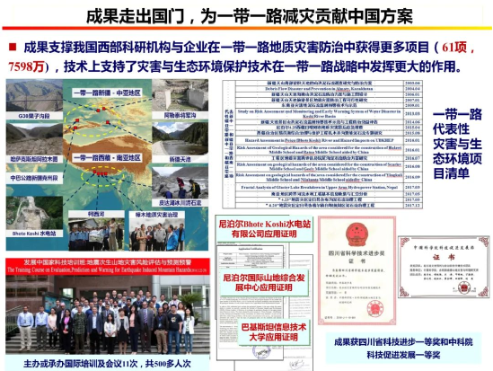 图10.1:成果应用于四川映秀红椿沟 面对泥石流灾害频发的局面,针对泥石流灾害预测预警难度大、工程防治理论支撑不足等问题,中科院成都山地所陈宁生研究员牵头的科研团队历经18年研究,创立了泥石流物源控制理论,揭示了干旱与地震联合驱动泥石流发生的机制;建立了分级多指标的泥石流预测、判识与预警系统,构建了泥石流高效能工程调控关键技术体系,典型示范工程分布于四川映秀、邛海,新疆天池和一带一路国家等;项目成果落地实施,推动了行业进步,提升了国家、地方科技减灾水平。成果受益人口130万,示范工程经济效益95.5亿元,减沙效益超过1.39亿m³。