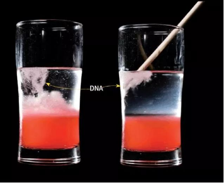 刑侦剧中的法医,有时会从血液或毛发样本中提取嫌疑犯的DNA,从而得出破获悬案的关键证据,最终确认出罪犯。他们给观众留下了深刻的印象:提取DNA需要各种高大严密的实验室设备。 事实上,借助简单的厨房工具,我们在家里就可以轻松做提取粗制DNA的小实验哦。 1准备材料。  这里我们需要的有:新鲜的菠萝(可用西柚酸橙等水果替代)、草莓、医用酒精、食盐、洗洁精、漏网、搅拌工具和筷子。 2将1~3颗的草莓去蒂(其他水果也可),加入100毫升水和一勺食盐,将草莓仔细碾碎、搅拌至没有明显的果肉颗粒(这里可以借助搅拌工具哦)。  原理 各种水果都是可以提取DNA的,本实验选择草莓主要是由于其“八倍体”的特性——每个草莓细胞中都有8份基因组,DNA含量高。另外,草莓更易碾碎、不必削皮去籽的特性也让实验更加简化。 食盐中的钠离子和氯离子可中和DNA上的电荷,让DNA变形聚集,使其在后续过程的提取中,更易沉淀出来。 3静置草莓果汁溶液片刻。  (悄咪咪喝一口) 4在所得悬液中加入5~10毫升洗洁精,加入几滴新榨菠萝汁,轻轻搅匀后静置10分钟,随后用滤网或者滤纸将悬液中的大颗粒滤除。  原理 细胞膜和细胞核膜的主要成分是脂质 ,洗洁精中的表面活性剂可破坏这一结构,将其中的DNA释放至溶液中。菠萝汁中的菠萝蛋白酶,可进一步将和DNA紧密结合的蛋白质消化掉,使我们得到更加纯粹的DNA。 西柚酸橙中也有与菠萝中相似的蛋白酶,因此也可以替换菠萝。 5将在冰箱冷藏过的医用酒精,沿着容器侧面缓缓倒入,此时可见酒精和草莓汁的明显分层现象。  原理 DNA是极性分子,乙醇是非极性分子。根据“相似相溶”的原理,DNA可溶解于水但难溶于乙醇,因此会在高浓度酒精中相互吸附形成沉淀。 冷却酒精是为了进一步降低DNA的溶解度,获得更多沉淀。 6静置一段时间后,我们就可以清楚的看到,在两种液体的交界处,白色的絮状DNA沉淀大量生成,并在浮力的作用下上升至酒精层上。 粘稠物(或类似絮状物)成团,即可用筷子将这些粗提的DNA取出。 |