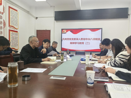 为推动深入贯彻中央八项规定精神学习教育走深走实,持续推进全面从严治党向纵深发展,提升党员政治理论素养,5月27日,机关四党支部按学习计划以党组织生活方式开展“深入贯彻中央八项规定精神学习教育(二)。组织生活由党支部书记侯成万主持。