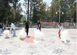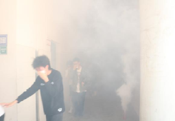 最后,陆铭宁院长宣布火灾演练、疏散演练正式开始:随着口哨声吹响,教学楼的烟雾弹浓烟四起,师生们快速弯腰低头、用湿巾捂住口鼻,有序地从教室撤离并前往疏散地点。到达疏散地点后,钟业举根据校园火灾特点向大家讲解了火场逃生基本知识、灭火器的正确使用等内容;在讲解的过程中,他不仅从理论上教育大家应增强消防安全意识,而且通过亲自示范正确使用灭火器和其他逃生工具,让大家切实体会具备基本消防安全知识的重要性。
