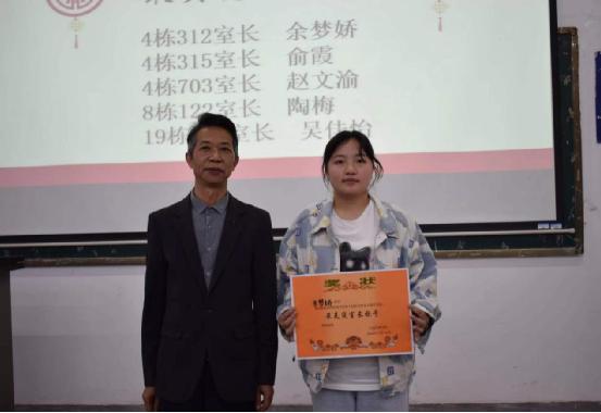 现场颁奖环节,肖立新教授为最美寝室长颁发奖状并一一合影留念,钟业举和潘东子分别为本次比赛中获奖寝室代表颁奖。