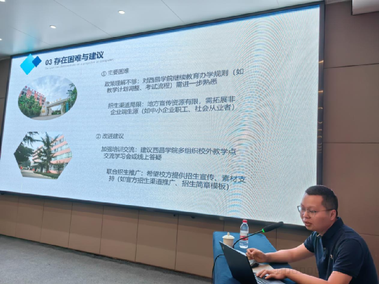 各校外教学点分别作了专题发言,交流办学经验,分享优秀管理案例。最后,大家就招生政策、线下面授教学组织、教学点运行中存在的共性难点等作了深入的研讨与交流,为促进学校继续教育提质增效提供新思路。