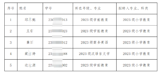 截至2024年8月31日学院接收到校内各二级学院转专业转入申请材料共邱思懿等5人,均申请转入小学教育专业。经学生所在二级学院审核,上述5人均满足学校2023级学生申请转专业条件,结合学校2024年6月学生转专业工作安排、我院2023级小学教育专业情况及2024年9月1日组织的考核情况,经学院党政联席会商议决定同意邱思懿等5人转入2023级小学教育专业,现将名单予以公示,公示期3天。