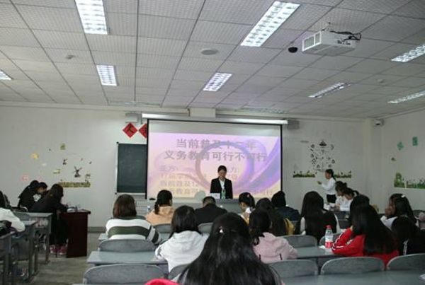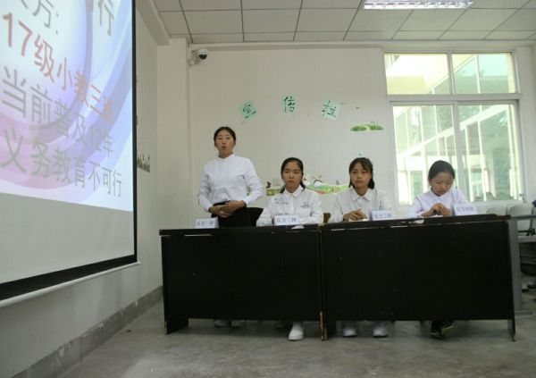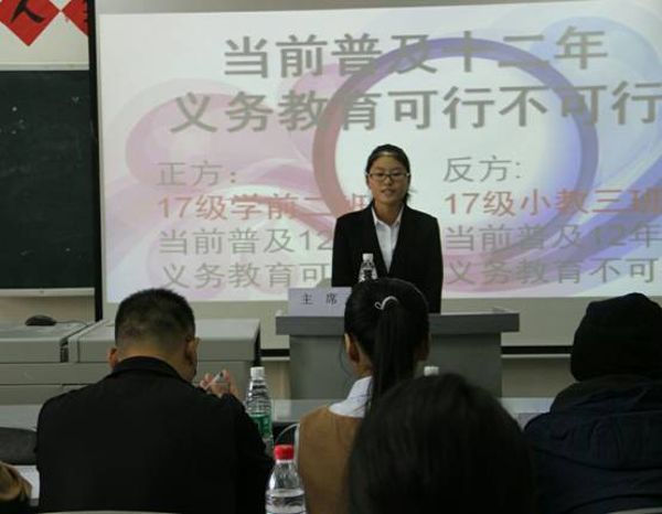 本次辩论赛的辩题是“当前普及十二年义务教育可行不可行”。正方为2017级学前教育三班,其观点为“当前普及十二年义务教育可行”;反方为2017级小学教育三班。本次辩论赛分为四个环节。首先,正反双方一辩阐述各方观点及论据;第二个环节为攻辩环节,双方围绕“当前”“普及”和“十二年义务教育”各自展开了辩论。紧接着是最激烈的自由辩环节,在此环节中双方辩手都展示了各自的口才与风采,侃侃而谈,势不可挡。然后双方四辩总结陈词。