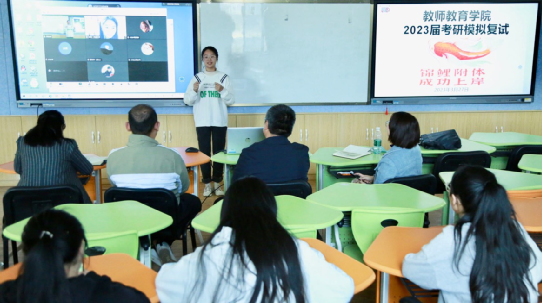 为让参加考研复试学生熟悉考研复试流程,掌握面试技巧,提升复试竞争力,教师教育学院于3月27日14:00—17:00在致知楼207教室举行了考研模拟复试工作。参加本次模拟复试的有学院党委副书记陈梅琴副教授、应用心理学教研室主任原军超博士、小学教育教研室主任杨瑞勋博士、专业教师杜玉博士、凌鹭博士、学生科老师郑友芬,以及14位自愿参与考研复试模拟的同学。本次考研复试模拟采用了线上线下结合的方式开展。