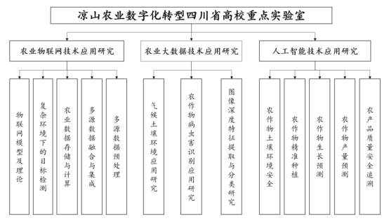 凉山农业数字化转型四川省高等学校重点实验室立足于凉山绿色崛起,全力 服务“中国凉山•安宁河现代农业硅谷”建设。实验室以计算机科学与技术、电子信息工程、农学等专业为基础,助力凉山实现农业数字化转型。实验室研究方向主要包括:农业物联网技术应用研究、农业大数据技术应用研究、人工智能技术应用研究。研究内容涉及农业物联网、农业大数据、人工智能等新一代信息技术,如图1所示。