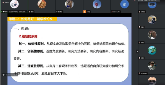 6月17日下午14:30学院举办“编辑面对面”线上期刊论文点评与写作指导讲座。此次讲座邀请了东北大学文法学院教授、博导颜德如以及《社会科学研究》杂志社编辑、副研究员陈果开展线上讲座,旅游与城乡规划学院党委书记姚小波、院长汪腾及旅游与城乡规划学院全体老师参加了本次讲座,讲座由汪腾、王丽丹分阶段主持。