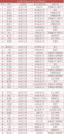 “汗马耕耘有矢志,天道酬勤佳音来时”。农业科学学院考研学子喜讯频传,我院2023届毕业生共录取研究生86人,占毕业总人数的30.07%,其中西南大学、北京林业大学、四川农业大学等“985工程”、“211工程”高校录取23名,占升学总人数的26.74%;其他知名高校录取63名。
