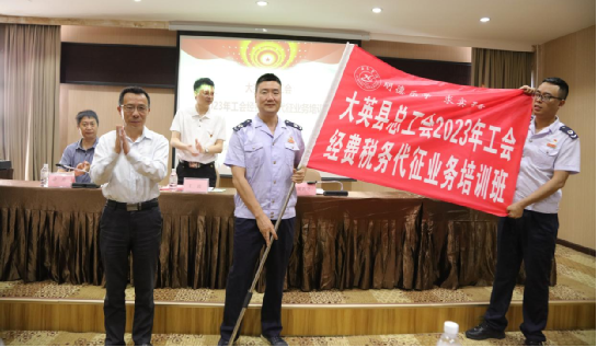 最后,胡青龙向大英县总工会2023年工会经费税务代征培训班的两名学员代表授旗,开班仪式圆满结束。