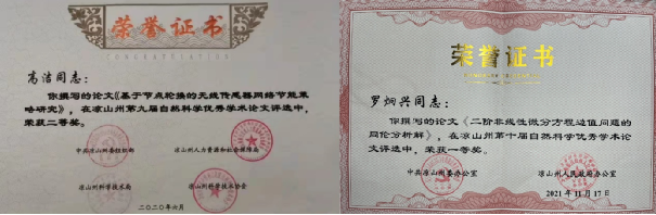 值得一提的是,继2020年6月,我院青年教师高洁的研究成果《基于节点轮换的无线传感器网络节能策略研究》获凉山州第九届自然科学优秀学术论文二等奖之后,2021年11月在凉山州第十届自然科学优秀学术论文评选中,青年教师罗炯兴的研究成果《二阶非线性微分方程边值问题的同伦分析解》获优秀论文一等奖。这是我院青年教师在自然科学研究方面取得的新突破。