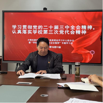 为深入学习宣传贯彻党的二十届三中全会精神及学校第三次党代会精神,10月11日下午,少数民族预科教育学院党委理论学习中心组在预科党员活动室召开专题学习会。会议由学院党委书记马史火主持,全体理论学习中心组成员参会。党委委员、副院长(主持工作)花旭斌、党委副书记、纪委书记卢凯、党委委员邓建平、江海洋等人员参会。