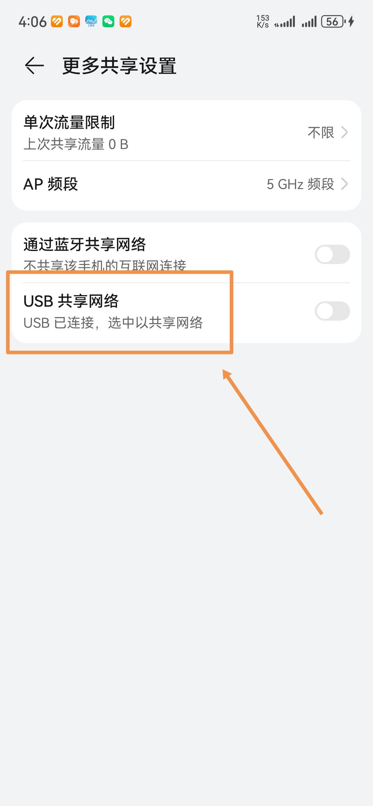 手机数据线连接手机和电脑,使用USB共享流量给电脑提供网络。