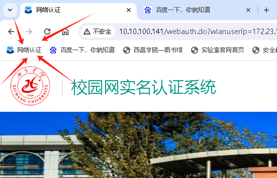 1、如果手机/电脑在连接网络后没有自动弹出校园网实名认证系统“网络认证”的窗口,可在浏览器地址栏中随意输入一个外网地址(如百度,见浏览器标签)访问,浏览器页面会显示无法访问,过十几秒会弹出“网络认证”窗口。如果仍然失败,可在电脑/手机浏览器输入IP地址10.10.100.141(推荐点击蓝色字体直接跳转)登录。