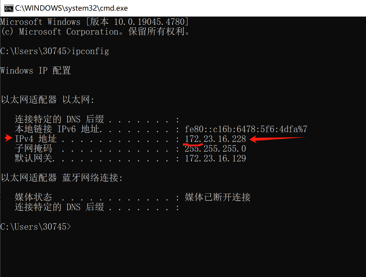 2、如果电脑连接网络后无法打开IP地址10.10.100.141,请按下键盘Windows徽标键(在键盘左下角Alt左边)+R键,在弹出的运行框中输入cmd,回车。在弹出的黑色会话框中输入ipconfig,回车。在弹出的内容中寻找 ipv 4 地址。