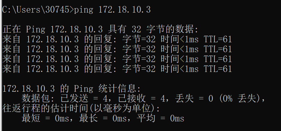 如仍不能解决,则可能是教室外的设备侵占了该机的IP地址,无法自行解决,请报告实验室办公室。(确认方法:在cmd命令行中输入ping 172.18.10.3,能Ping通,如下图所示,丢失=0)