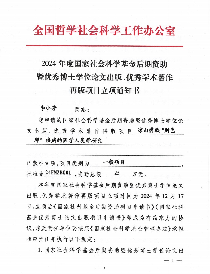 近日,2024年度国家社会科学基金后期资助暨优秀博士学位论文出版、优秀学术著作再版项目立项结果正式公布,图书馆副馆长李小芳教授主持申报的《凉山彝族“斯色那”疾病的医学人类学研究》获批为国家社会科学基金后期资助一般项目,项目批准号24FMZB001,项目类别:国家一般。