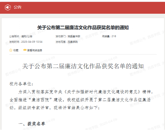 为深入贯彻落实党中央《关于加强新时代廉洁文化建设的意见》精神,全面推进“廉洁西院”建设,学校组织开展了第二届廉洁文化作品征集活动,活动以“清风正气盈西院·廉洁润心沐桃李”为主题,面向全校师生征集书法类、美术类、摄影类、视频类、创作类等五大类作品。2025年4月9日,经组织专家评审,共评出一等奖3项,二等奖9项,三等奖16项,优秀奖14项,优秀组织奖5个。 本次活动中,图书馆荣获三等奖两项,分别为黄睿老师的美术类作品《清风颂》,胡侠老师的视频类作品《毛主席在边家大院的故事》。图书馆通过组织本次征集活动,大力弘扬了我馆团结奋进、求真务实、崇廉尚洁的主旋律,营造干部廉洁从政、教师廉洁从教、员工廉洁从业的良好氛围。 |