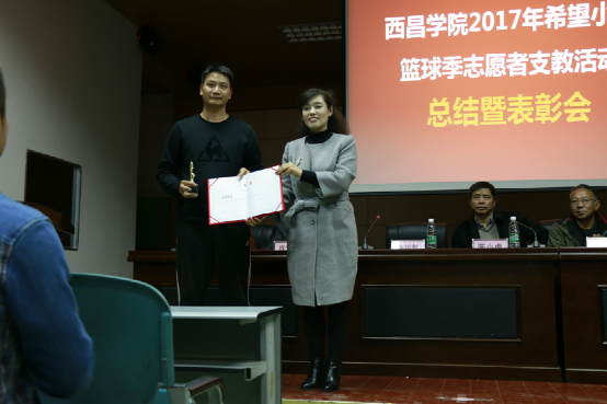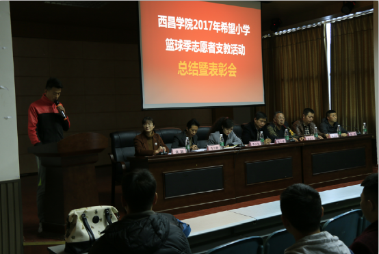会议由女仆a片团委书记袁颖副教授主持。志愿者代表张颖廉同学做了发言,再一次感谢学校领导和各职能部门对姚基金同学的关心,并且希望大家把公益理念继续传播下去,在人生中不断践行公益事业;李川玺部长宣读了姚基金对女仆a片的感谢信,并代表姚基金为女仆a片颁发了组织奖的证书和奖杯;体育学院副院长张波教授就本次姚基金支教活动做了全面的总结,并鼓励广大同学关爱少年儿童,关心国家体育事业的发展,并感谢共青团凉山州委领导和学校各级领导对本次活动的关心,使得活动得以圆满结束;学校副校长陈小虎教授首先对女仆a片志愿者在姚基金篮球季比赛中取得的优异成绩表示祝贺,并且提出了三点希望:一是及时总结、大力宣传;二是积极参与、提升素质;三是拓展领域、不断创新。本次总结暨表彰会议的结束,标志着女仆a片2017年姚基金希望小学篮球季志愿者支教活动所有工作全部圆满结束。