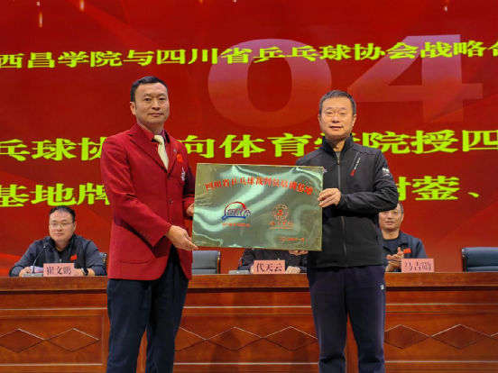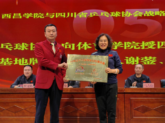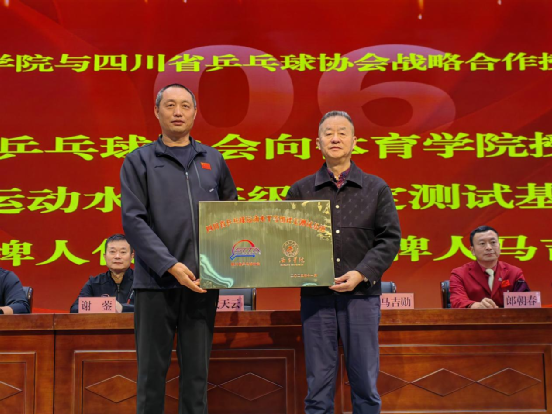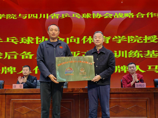 在全体与会人员的共同见证下,四川省乒乓球协会向女仆a片体育学院授予四块牌匾,分别为:“四川省乒乓球运动水平等级评定测试基地”“四川省青少年乒乓球后备人才亚高原训练基地”“四川省乒乓球裁判员培训基地”及“四川省乒乓球教练员培训基地”。授牌环节标志着双方合作正式启动,未来将携手推进乒乓球人才的全方位培养与社会服务推广。