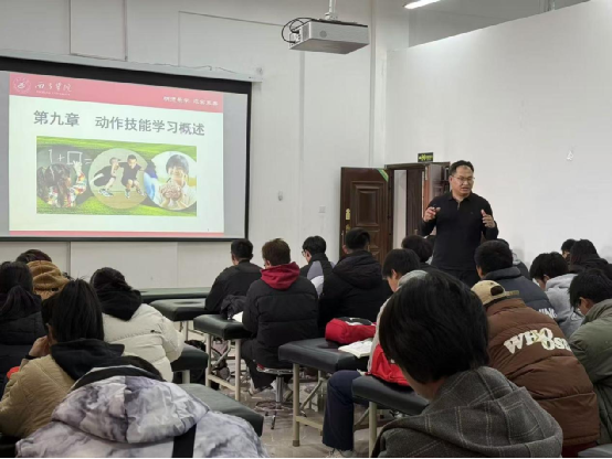 2024年12月13日16时,体育学院实验实训室主任、运动与健康服务省级实验教学示范中心常务副主任、国家级社会体育指导员、国家体育总局运动营养师培训师、运动处方师、中国体育科学学会会员、中国解剖学学会运动解剖学分会会员李龙博士在我院体育保健实验室为我院师生讲授一堂“动作技能学习概述”示范课。四川应用技术职业学院运动与健康学院党总支副书记雷晓莉、党支部宣传委员万玉丹、教研室主任曾晓芳、专职教师张其亮、王沁煜以及社会体育专业、社区康复专业学生代表、我院2023级运动康复专业全体同学参加。