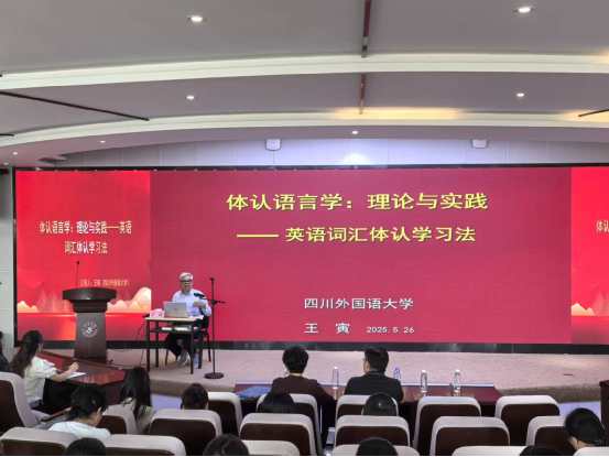 为促进教师教学创新,助力学生掌握英语词汇学习法,2025年5月27日我院特邀四川外国语大学王寅教授在致知楼环形学术报告厅开展“体认语言学:理论与实践——英语词汇体认学习法”主题讲座。参与本次讲座的有外国语学院党委书记文宇,院长陈红梅,全体教师及2023级、2024级部分学生。本次讲座由英语教研室主任杨红主持。