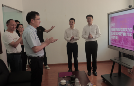 朱占元校长首先与文化传媒学院的领导和博士们进行了座谈。文化传媒学院院长叶俊莉从专业建设、学科建设、师资队伍建设、人才培养、博士发展以及对外合作等方面向校长做了详细汇报。朱占元校长对文传学院当前工作所取得的成绩表示肯定,并对学院在发展建设中遇到的问题和困难给出了针对性的解决意见和建议。